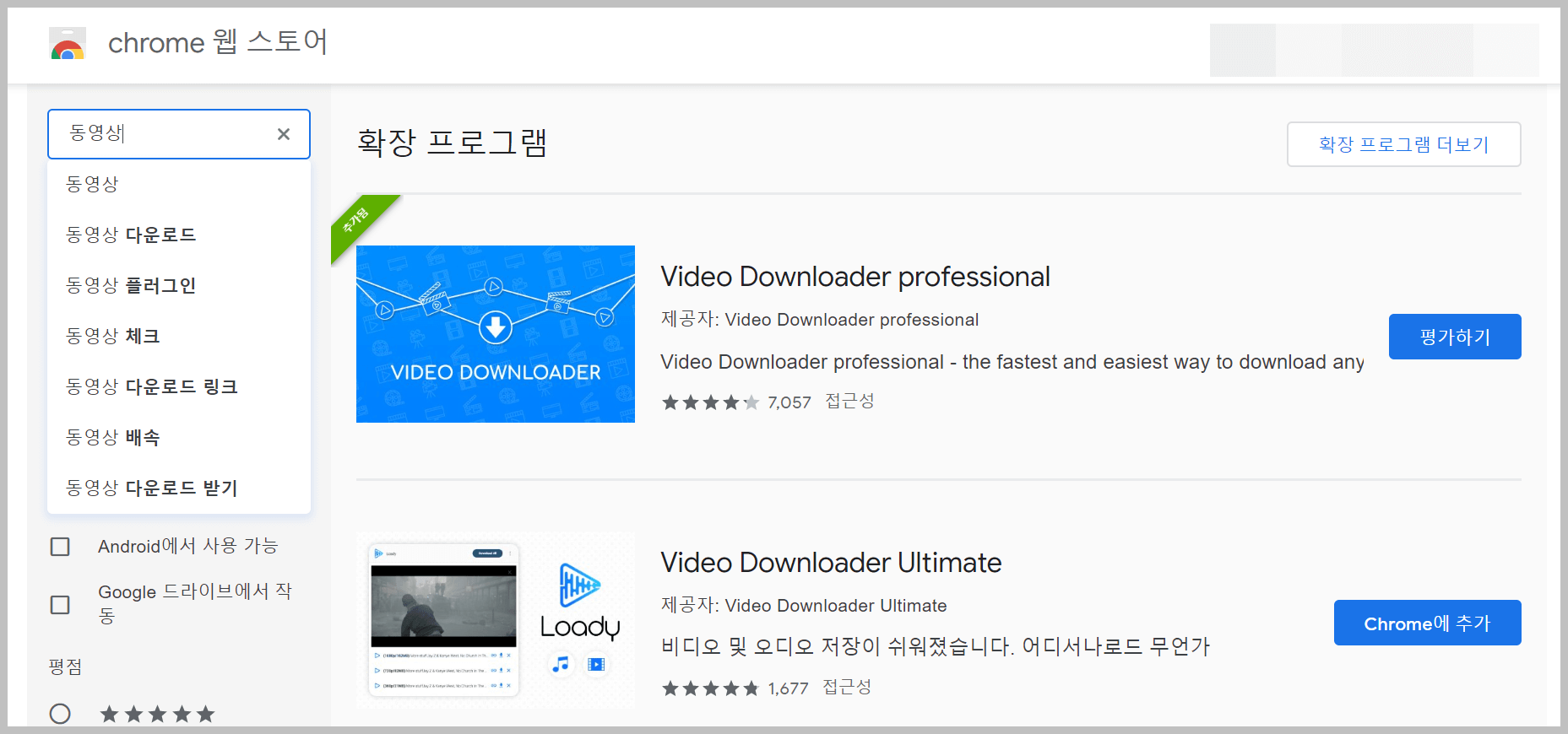 웹스토어 검색창에 동영상 이라고 입력만 하셔도 다음과 같이 다수의 동영상 Downloader 프로그램이 나오는 것을 보실 수 있습니다.